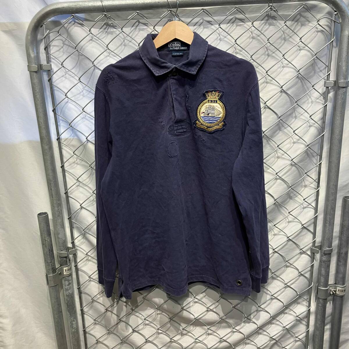 > 90s POLORALPH LAUREN 長袖ポロシャツ ワッペンポロシャツ ネイビー XL ラルフローレン 店舗受取可