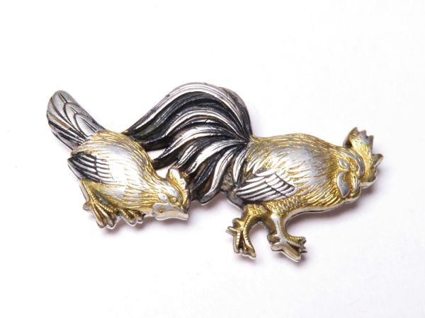 - 【12150】和装小物 大正~昭和 銀地 番鶏 彫金 帯留め(初品・買取品)