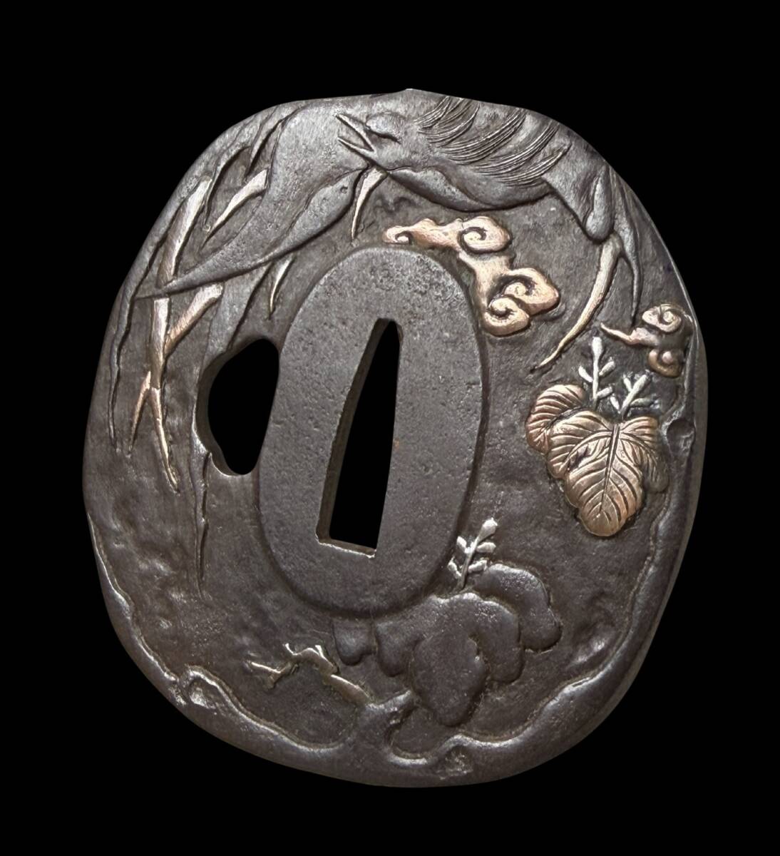 - 【偲】江戸時代 鉄地鐔 銀象嵌『鳥 木』細工 鍔 つば 居合用 日本刀装具 直径約7.2cm 重さ約146g r-997