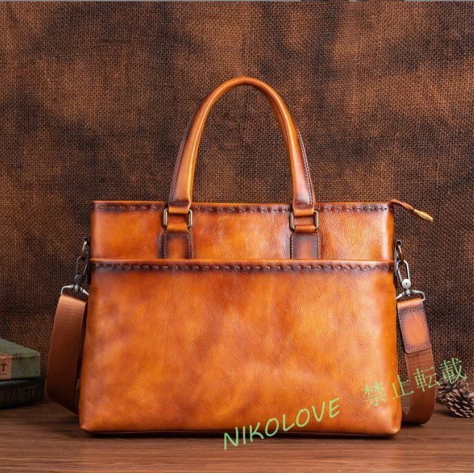 - ☆新品手作り 手染め ヌメ革 ハンドメイド メンズバッグ 本革 ビジネスバッグ ブリーフケース レザー 通勤鞄 手提げバッグ 出張