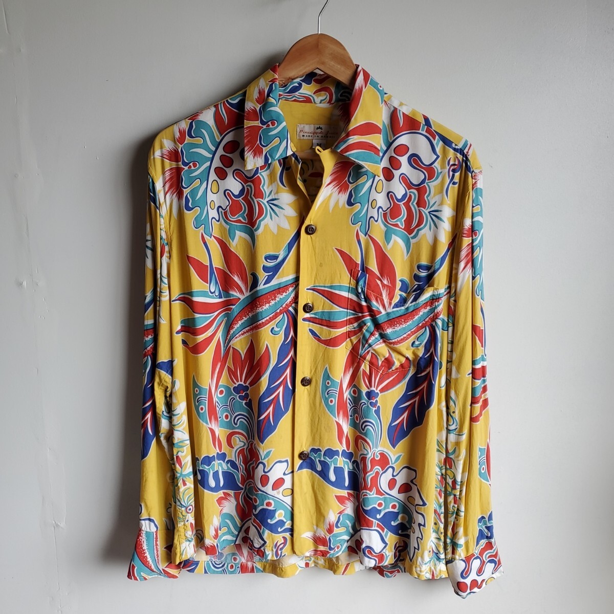 > 1134◆【sizeM】USA製 PINEAPPLE JUICE 長袖 アロハシャツ レーヨン ハワイ製 黄色ベース リーフ柄 総柄 中古 USED