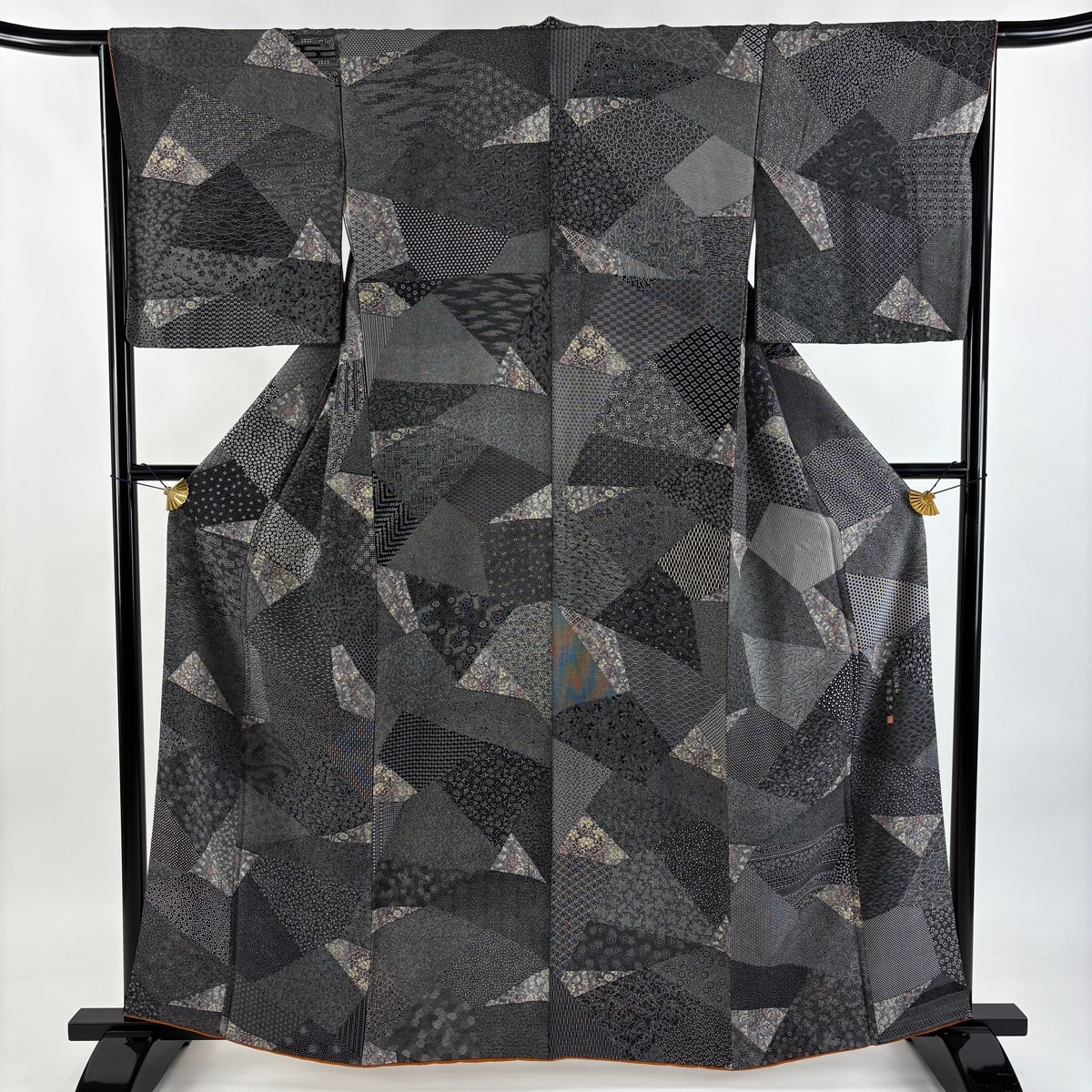 > 【美品】 小紋 身丈162.5cm 裄丈65cm M 袷 染谷梅治 落款 寄せ柄 黒灰 正絹 秀品 【中古】