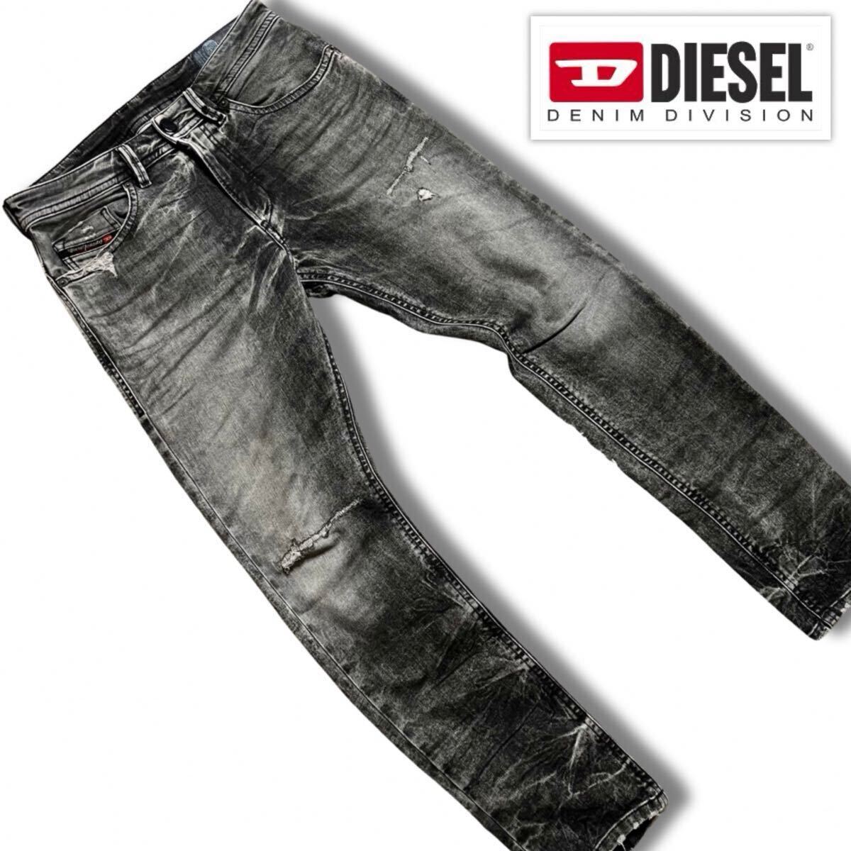 > 現行 希少Lサイズ●DIESEL ディーゼル デニムパンツ ジーンズ Gパン ブラック 黒 W32 ダメージ加工 ウォッシュ ロゴ刻印 レザーパッチ