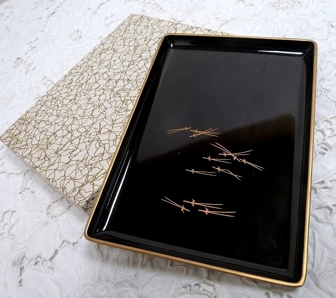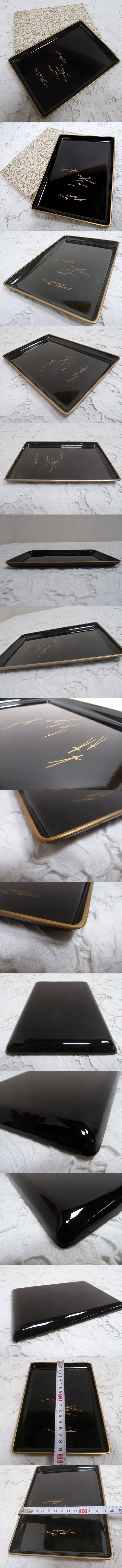 > (☆BM)黒 漆器 木製 名刺盆 切手盆 祝儀盆 19.6×13.7㎝ 金縁 松紋 松葉 漆芸 漆塗り マネートレイ トレー プレート 小物置き