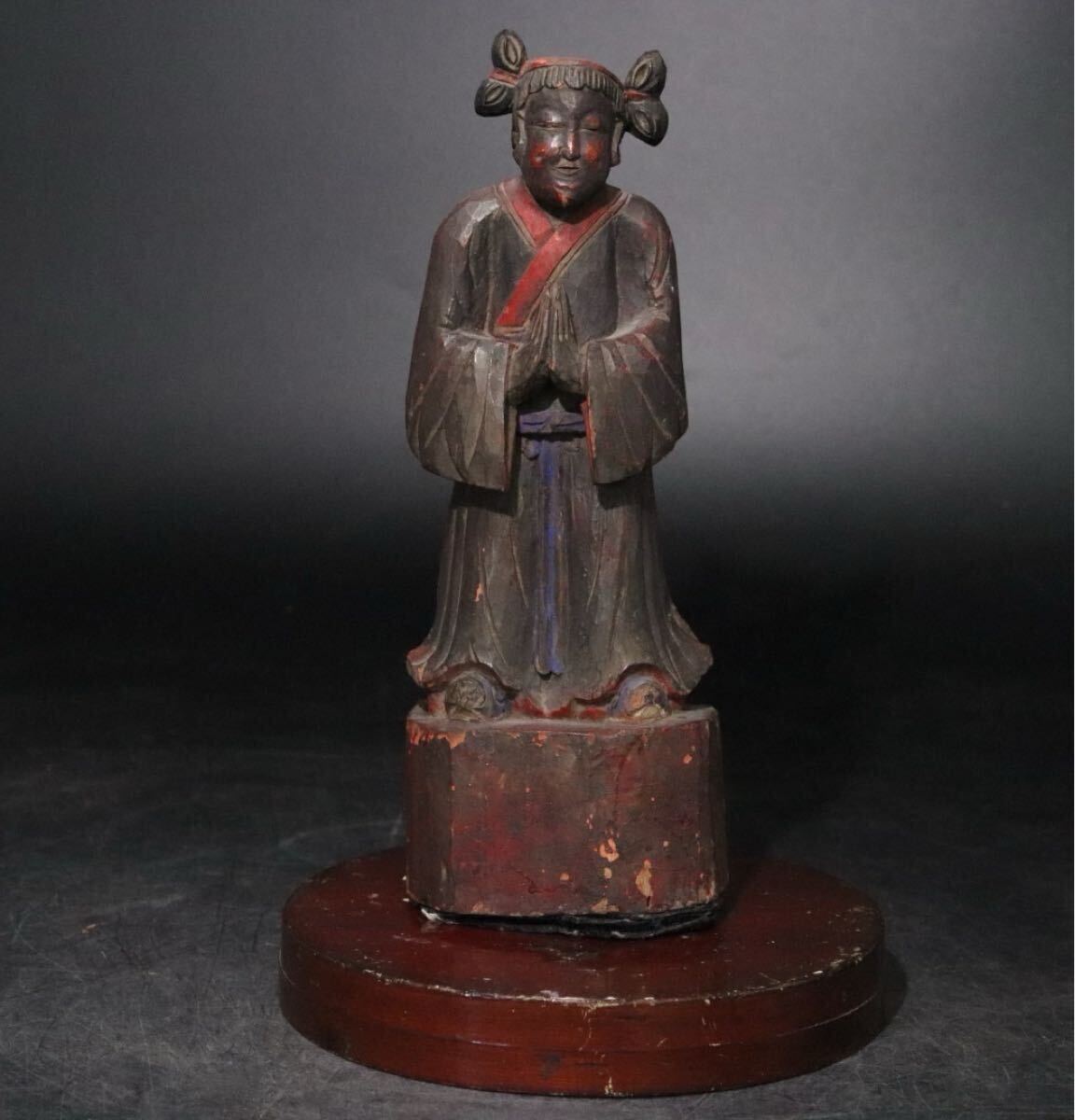 - 時代 木製 彩色 人物 立像 台座付 / 中国美術 木彫 置物 煎茶飾 仏像 .B1286