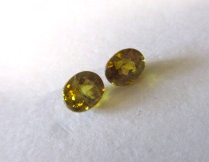 飴色のスフェーンの1ペアです。赤やグリーンのファイアーがチラチラしています。ファイアーの出方に差があります。透明感とテリがあります。非加熱。
