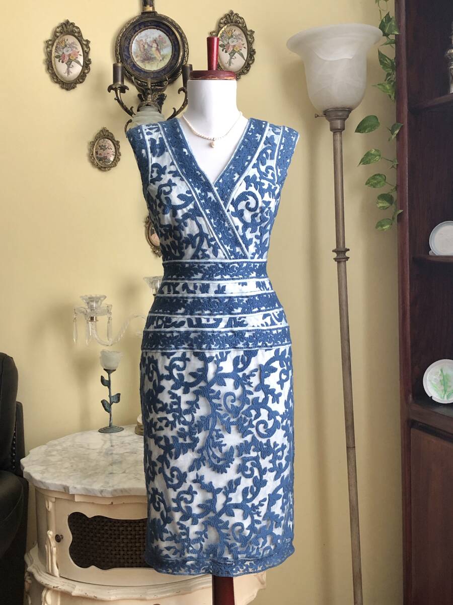 - 【TADASHI SHOJI/タダシショージ】美カット/ブルー刺繍ネットレース/カクテルドレス (US・2/7号~9号S)#237