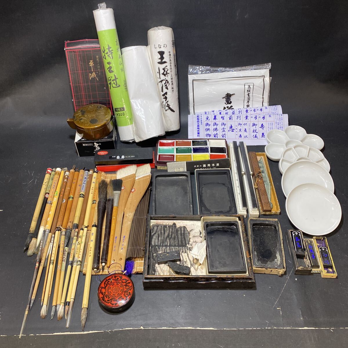 - N 6774 [ 書道具 まとめて!!] 水墨画 硯 硯箱 すずり 墨 書道セット 半紙 文鎮 箱入り 中古 未使用品 筆 保管品 現状品