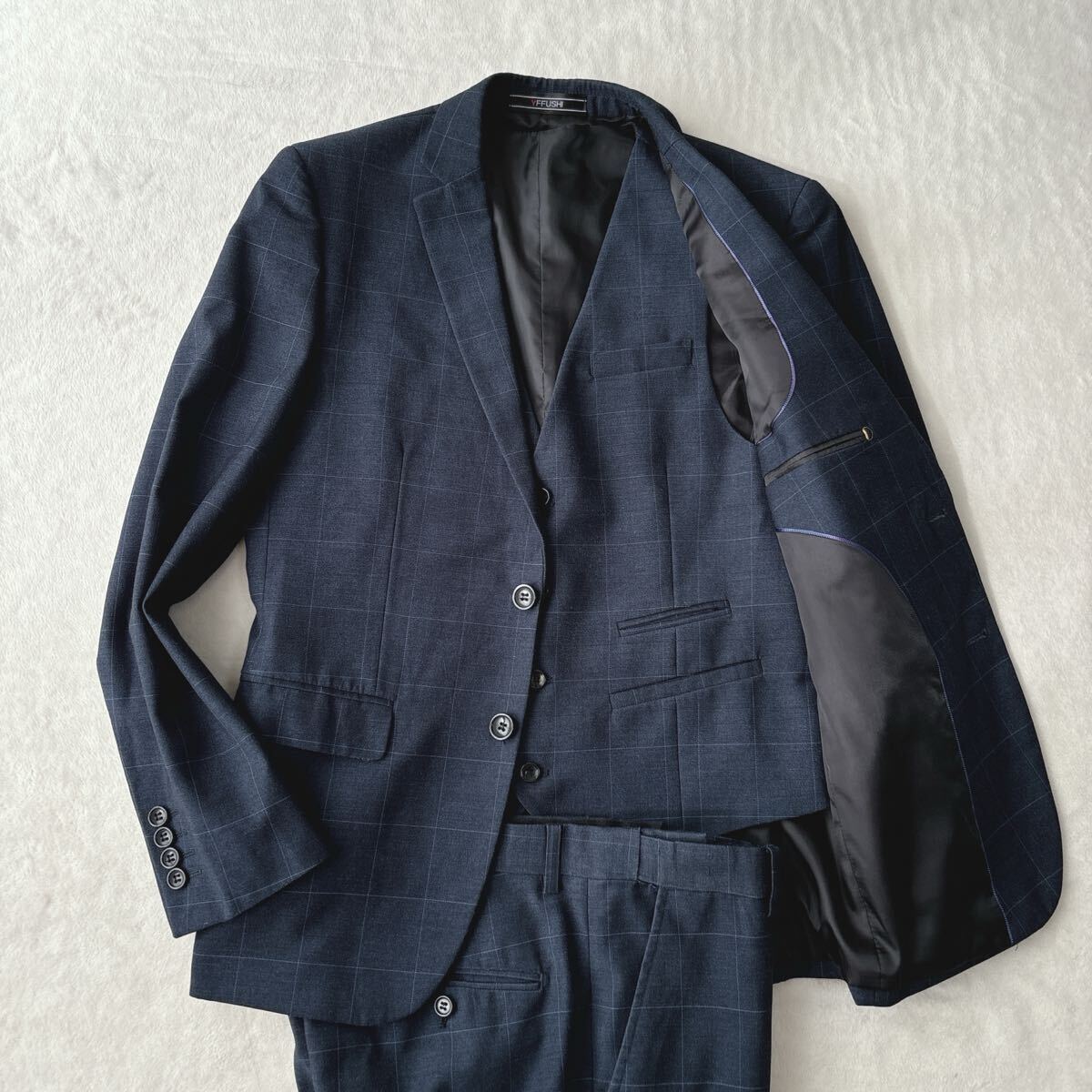 - 【美品】YFFUSHI スリーピーススーツ ネイビー チェック柄 紳士服 ビジネスマン テーラードジャケット ジレ ベスト スラックス