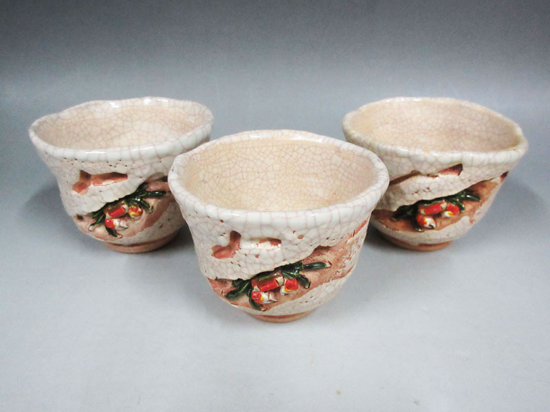 > ☆B70 美品 【天神蟹彫湯呑】 3客 楽山焼 在銘 『玉井楽山』 細密彫刻 蟹 カニ 伊予 茶道具 煎茶道具 茶器 湯呑 猪口 骨董品 アンティーク