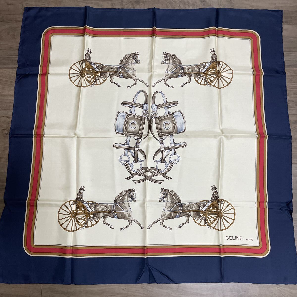 - CELINE セリーヌ スカーフ シルク100 ネイビー 馬車柄