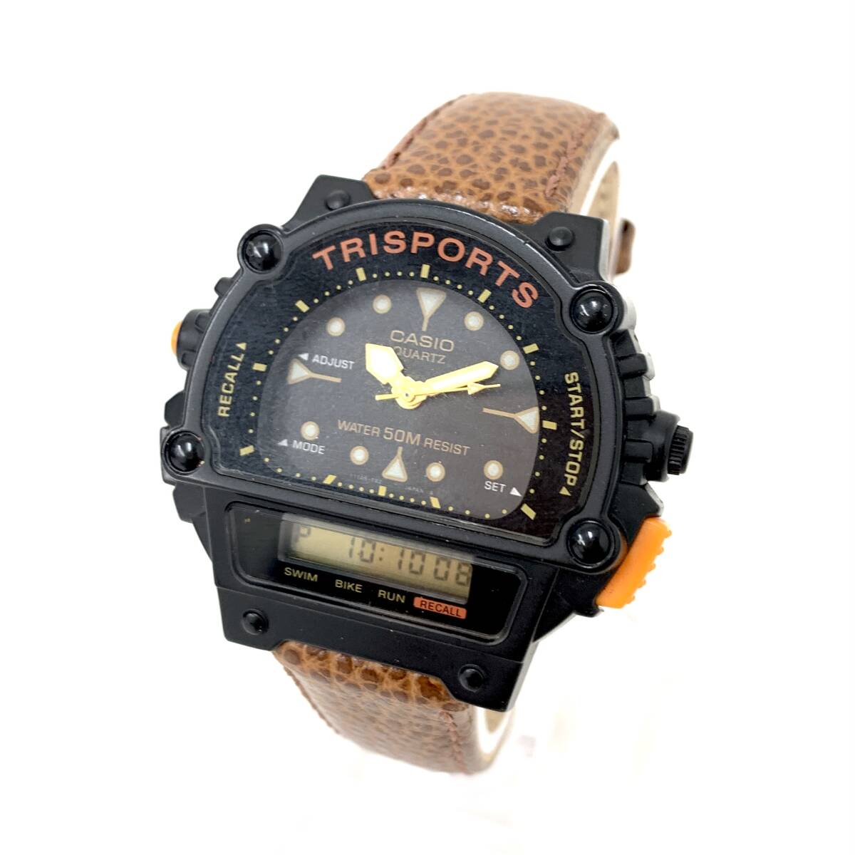- Z1254△ 1円~! CASIO カシオ TRISPORTS トライスポーツ TRI-10W SS×革 QZ 黒文字盤×デジタル文字盤 メンズ 腕時計 稼働 動作確認済
