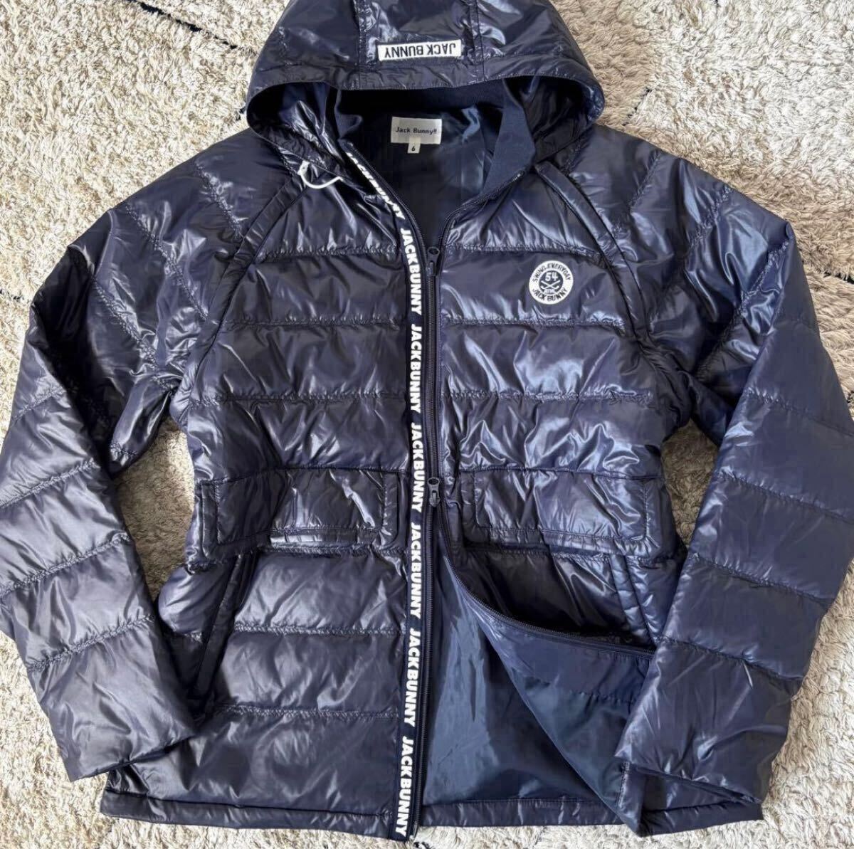 > 極美品◆XLサイズ!6 Jack Bunny ジャックバニー ダウンジャケット ダウンベスト ロゴ ワッペン ジップ ゴルフウェア ネイビー フード