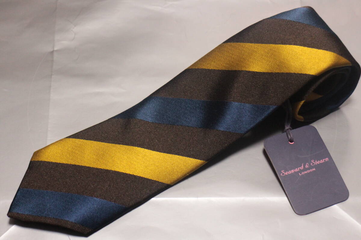 - シーワード&スターン*バーニーズ新品ネクタイ超華麗艶ゴールド*ブラウン*インクネイビーレジメンタル織柄切返しフルハンドメイド