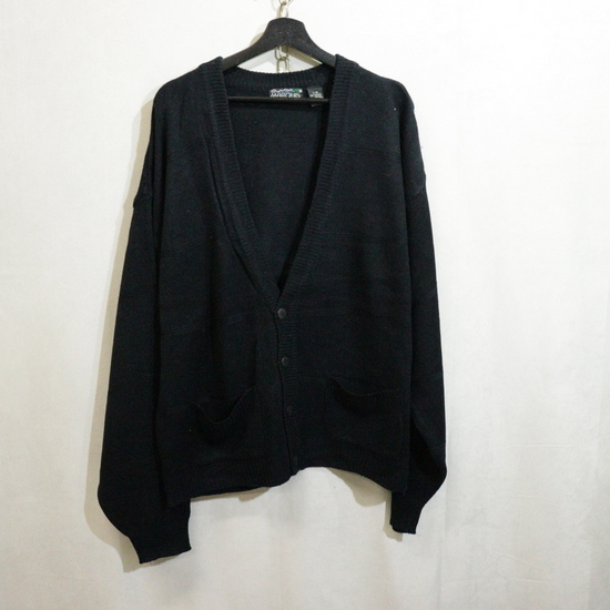- r422 80sビンテージ MARQUIS アクリルニットカーディガン■1980年代製 表記Lサイズ 黒 ブラック ボーダー 無地 アメカジ 古着 古着卸 激安