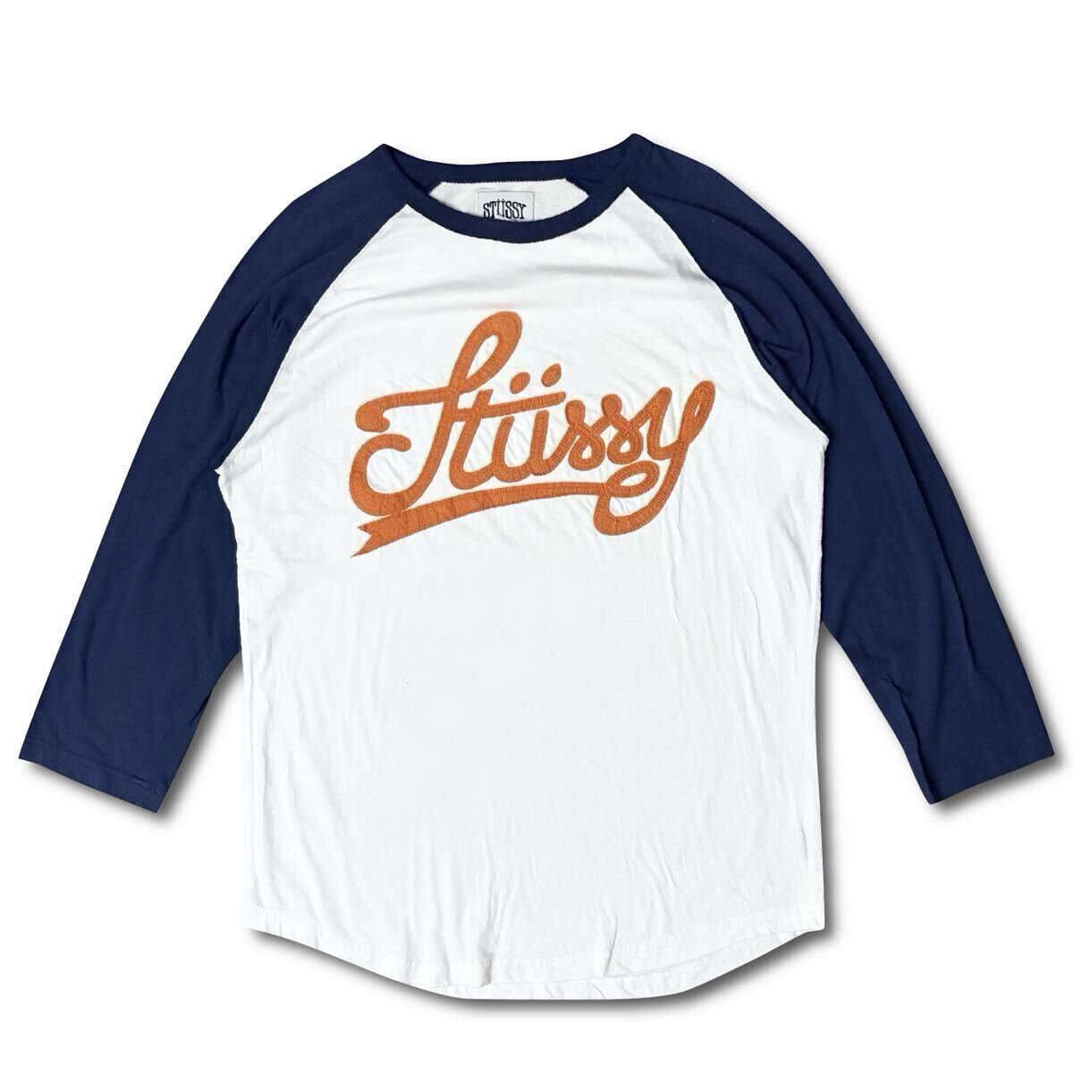 - 【00s】Stussy Logo Raglan Tee M White ステューシー ラグラン Tシャツ ヴィンテージ ホワイト / ネイビー レア 刺繍ロゴ トップス