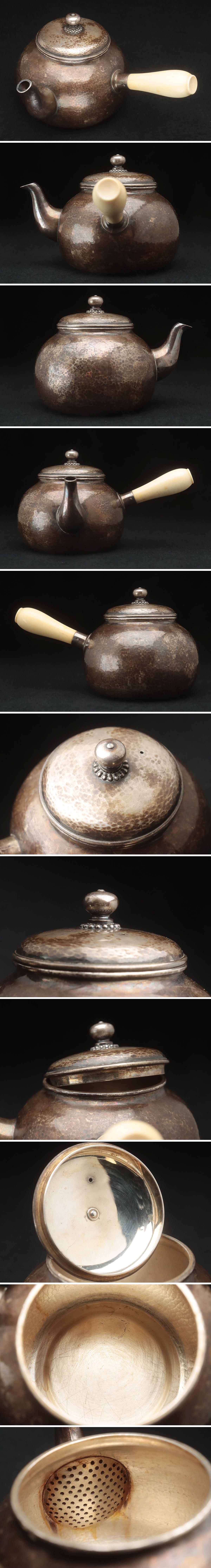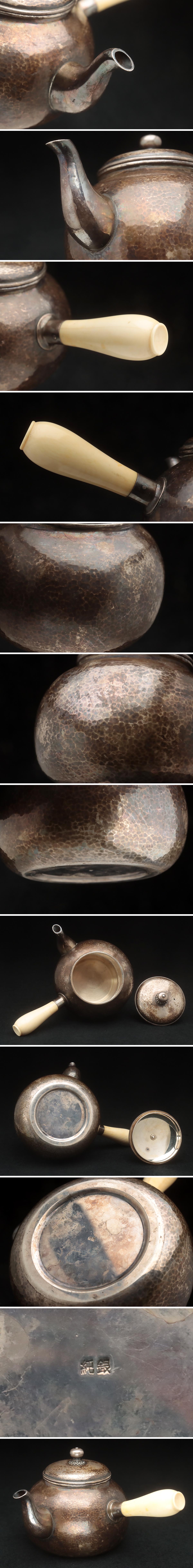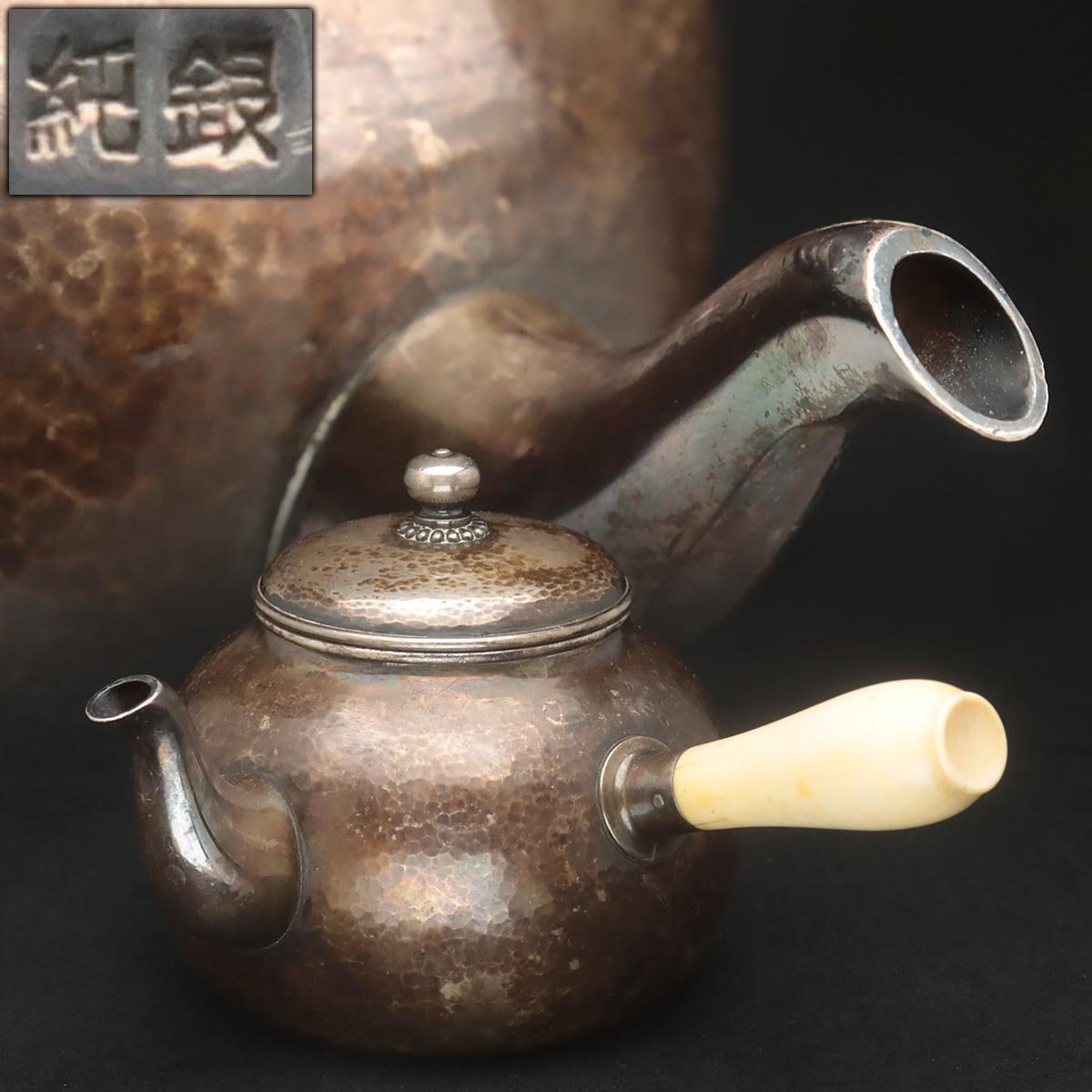 - FD379 時代金工 純銀 鎚目 煎茶 急須 重254g 純銀刻印・純銀牙横手急須・茶注・茶銚 茶具 茶器 煎茶道具 古美術