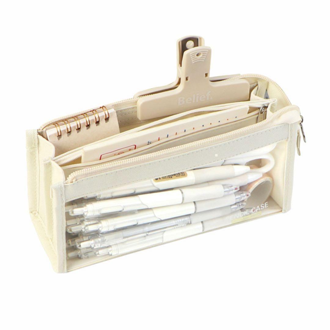 - 両面クリアペンケース アイボリー 大容量 シンプル