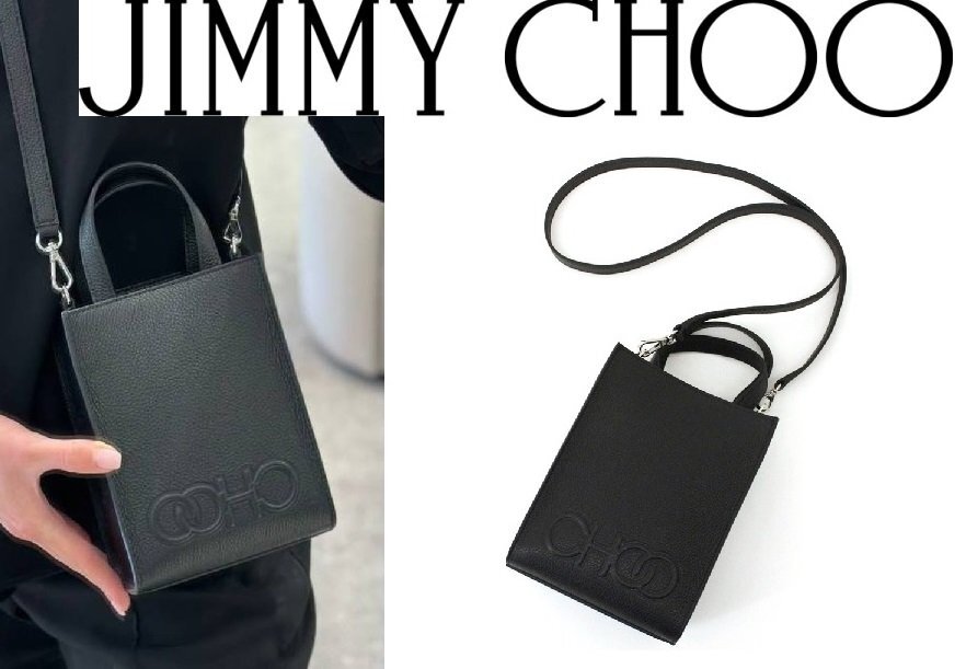 > ●20万新品◆JIMMY CHOOジミーチュウ◆エンボスロゴ入りレザー 軽量クロスボディ・ミニトート2wayバッグ 黒 1円
