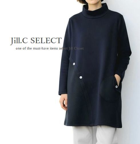 > 新品*NAVY【送料185円】伸縮◎異素材切り替えデザイン*ふんわりスタイルカバー♪ニットソー素材*飾りボタン付*プルオーバー*チュニック7730