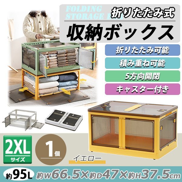 > 送料無料 収納ボックス 折りたたみ 1個 約66.5×47×37.5cm 2XLサイズ 95L イエロー キャスター付き 5面開閉 観音開き 積み重ね