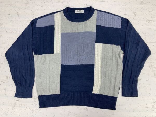- Lordy オールド レトロ 古着 スポーツ ゴルフ 綿麻 幾何学ジオメトリック ジャガード ニット セーター メンズ L 青系