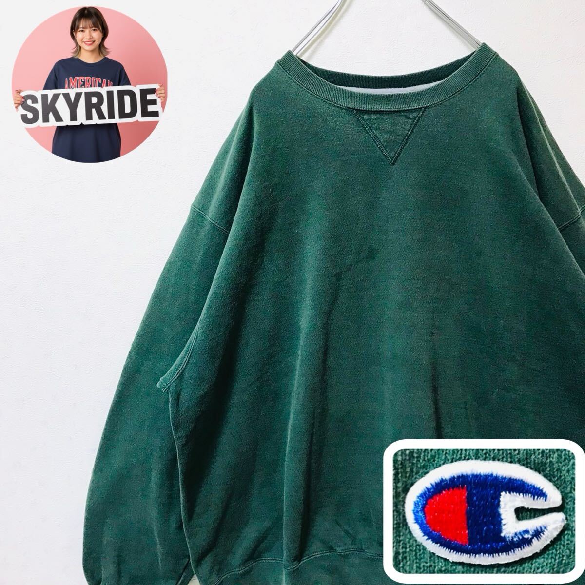 > 90s Champion チャンピオン スウェット トレーナー Cロゴ刺繍 XXL グリーン コットン混 ビッグシルエット アメカジ 通年着用可 #TT0394