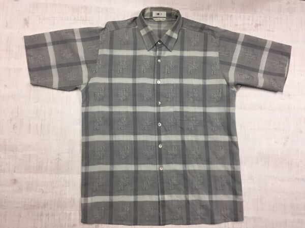 > ROCK レトロ オールド 古着 トラッド チェック サマーウール シェルボタン グリフォン柄 半袖シャツ メンズ ウール100% グレー