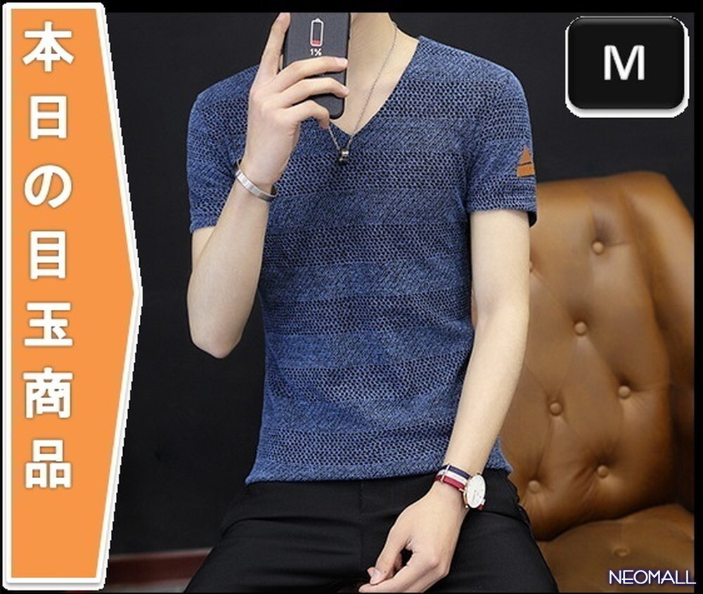 - 今日の目玉 ☆ Vネック 半袖 Tシャツ【298】ブルー Mサイズ トップス お洒落 シンプル 春夏