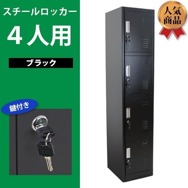 - 送料無料 ロッカー おしゃれ スチールロッカー 4人用 ブラック 鍵付き かぎ付き スペアキー付き 1列4段 スチール製 収納 事務所 会社 店舗