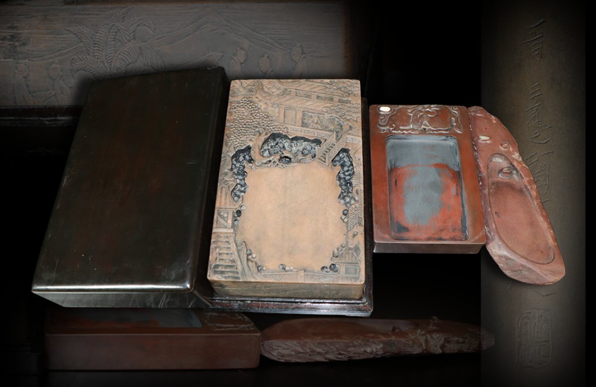 - 【江】中国古玩 唐物 硯 3点まとめ 木製蓋台座付建造物風景人物立体彫硯 牛彫硯 古美術品(書道具文房具習字)AX1823 CTDBllswe DBzoiu
