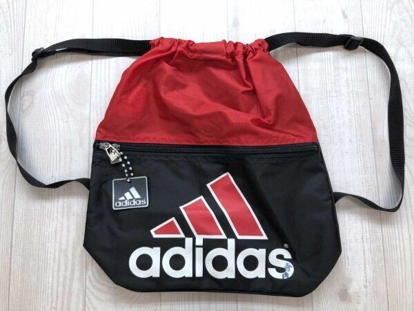 > アディダス adidas スポーツ スクール 平成レトロ 配色切替 ネームタグ キーホルダー付き ナップサック リュック カバン 日本製 黒赤