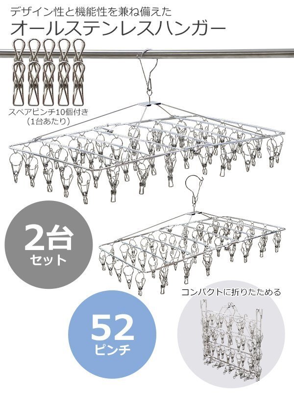 - 送料無料 ステンレスハンガー 折りたたみ ピンチハンガー スクエア 2個セット 52ピンチ 予備ピンチ20個付き フレーム径4mm SUS201