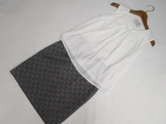 - 美品 ELLE PLANETE等 シフォンカットソー+膝丈セミタイトスカート コーディネート2点セット S相当 白/グレー系 総柄 きれいめ系 30代~40代