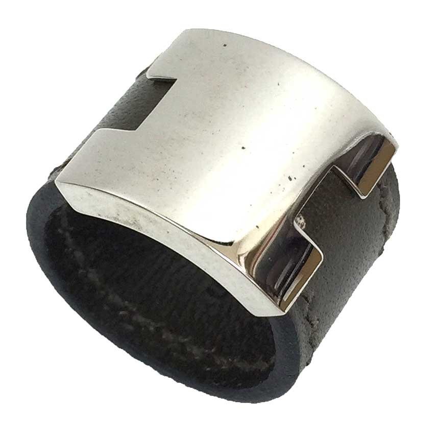> 全国送料無料 HERMES エルメス Hレザーリング 指輪 リング Sサイズ カーキ シルバー アクセサリー aq10467