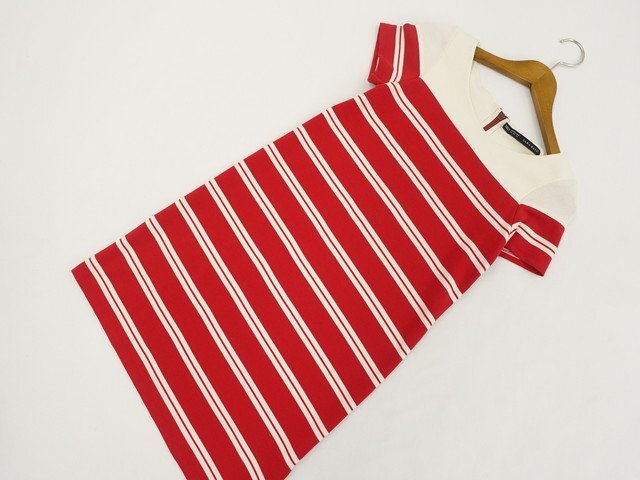 > 美品 ザラベーシック ZARA BASIC 洗える ひざ丈 半袖 ラウンドネック ワンピース USA:XS オフホワイト×レッド ボーダー柄 【メール便可】