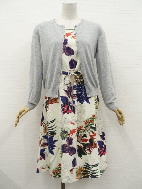 > 美品 UNIQLO等 長袖カーディガン+ロング丈ノースリーブワンピ コーデ2点セット S相当 グレー杢/アイボリー地 草木柄 フェミニン系 20代