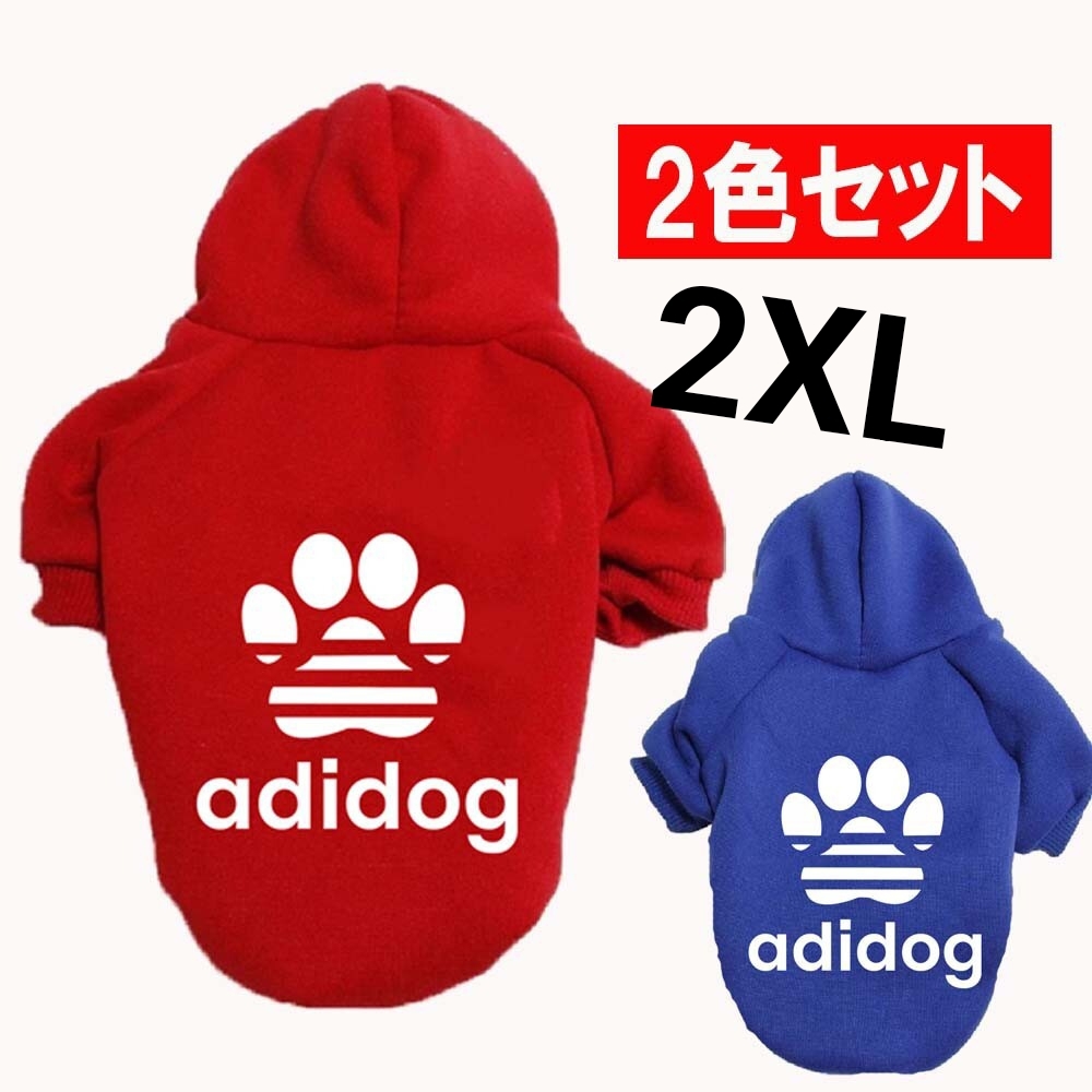 - 2XL レッド、ブルー 犬服 2色セットアディドッグ肉球パーカー 裏起毛パーカー裏起毛あったかい