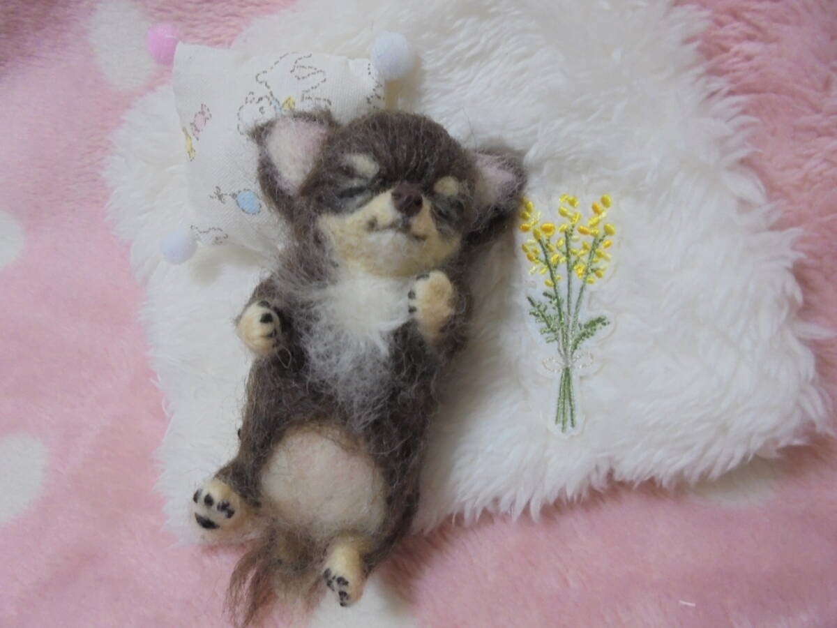 > ☆ハンドメイド羊毛フェルト☆ ねんねチワワチョコタン赤ちゃん♪身長約10.5センチ (手作りマット♪クッション♪)