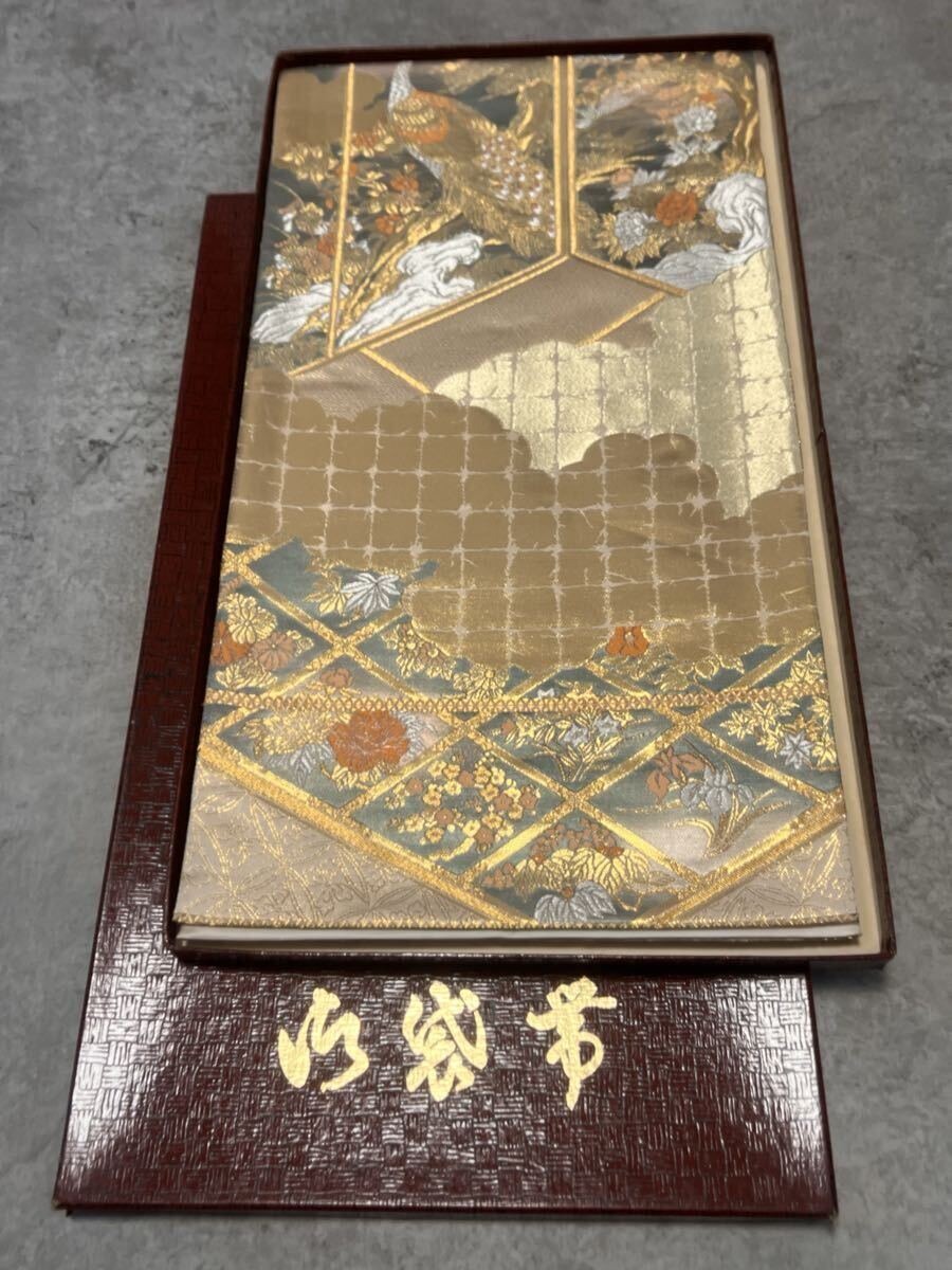 - 帯 純金箔 屏風孔雀文様 正絹 袋帯 織物 金糸 きもの 箱付き