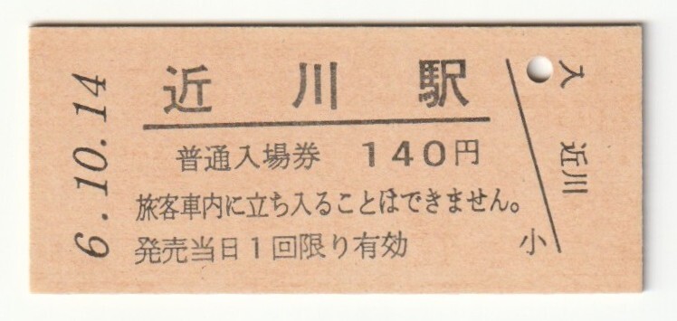 - 平成6年10月14日 大湊線 近川駅 140円硬券普通入場券(日付印刷)