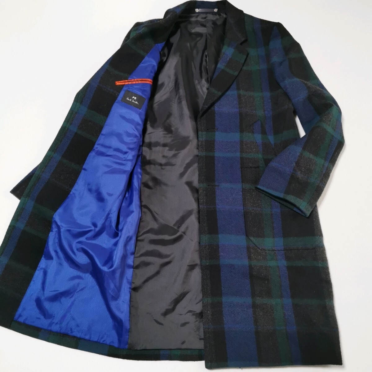 > 極美品!! PS Paul Smith ポールスミス 現行タグ チェスターコート ブラックウォッチ チェック柄 ロングコート ウール アウター M メンズ