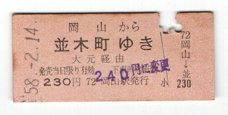 - T 国鉄 山陽本線 岡山から 大元経由 並木町ゆき 連絡乗車券 S58年 T