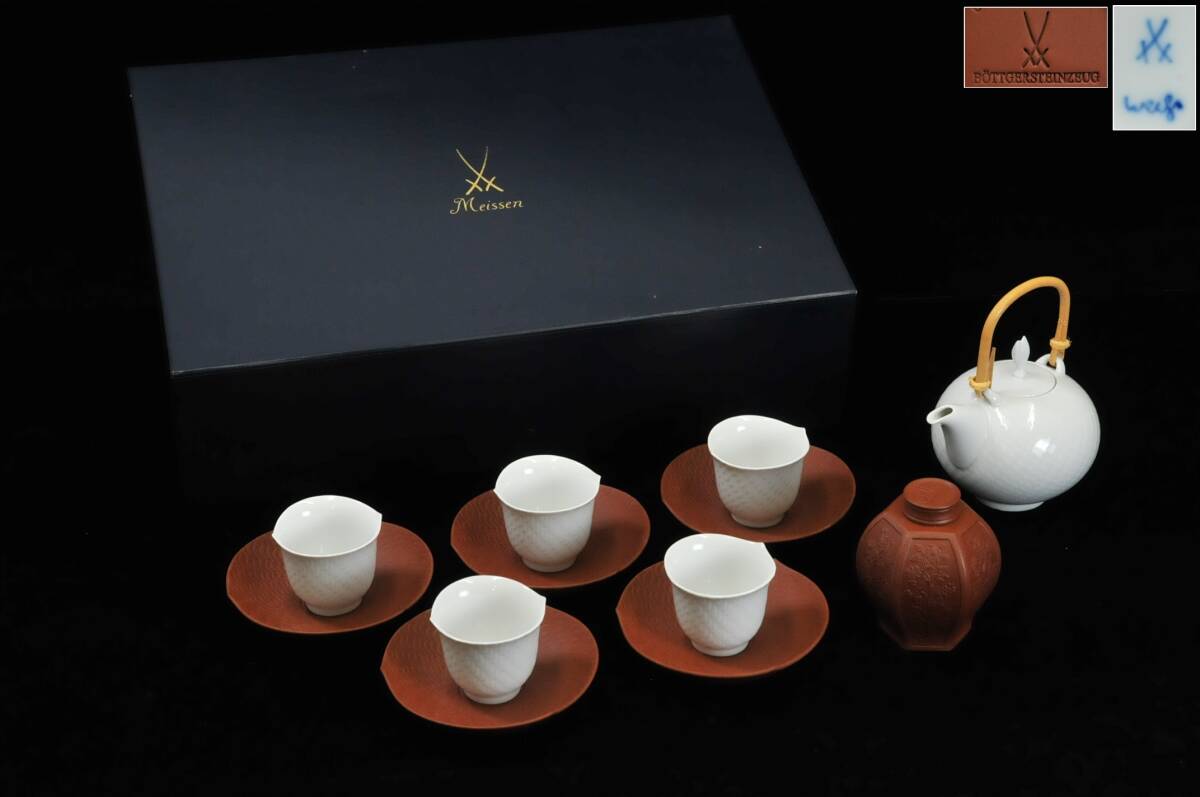 > MEISSEN マイセン 煎茶器セット 波の戯れ(急須・湯呑5客) ベドガーせっ器(茶托・茶壷) 化粧箱 03410021-1