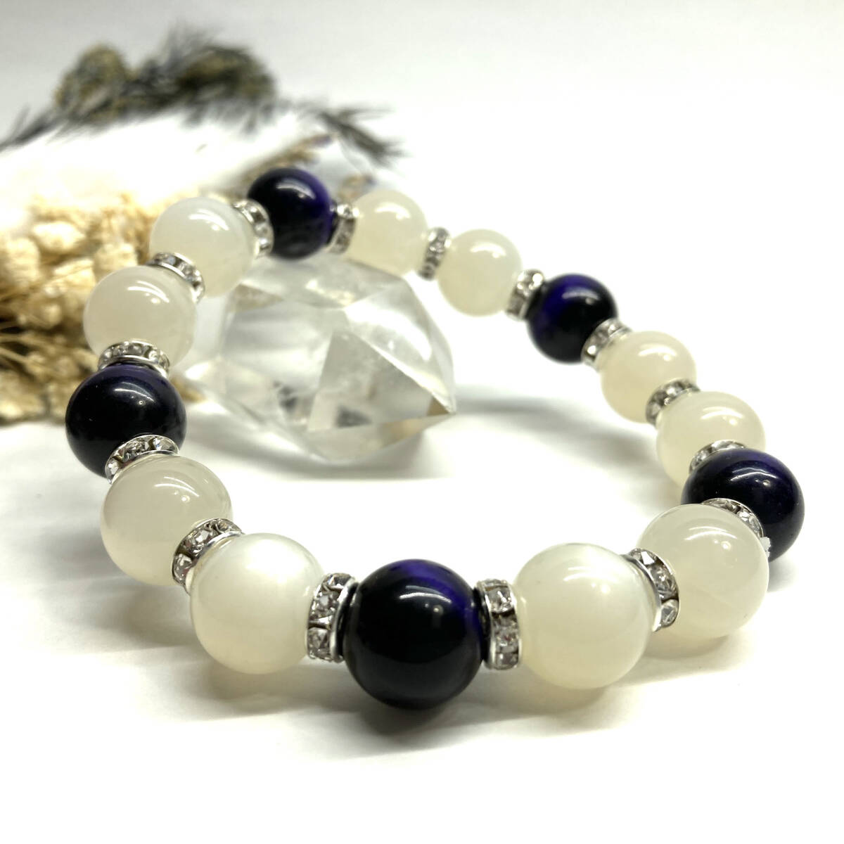 - ムーンストーン&パープルタイガーアイ パワーストーン ブレスレット 天然石ブレス (シルバー) 12mm 幸運 開運 メンズ 男性♪