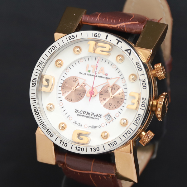 - 1円 稼働 QZ 良品 I.T.A ビーコンバックス Mod.00.05.05 白文字盤 クロノ デイト メンズ腕時計 0077000 10MGT KRK