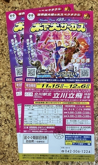 - ◆◇木下大サーカス(立川)招待券2枚(送料無料)◇◆