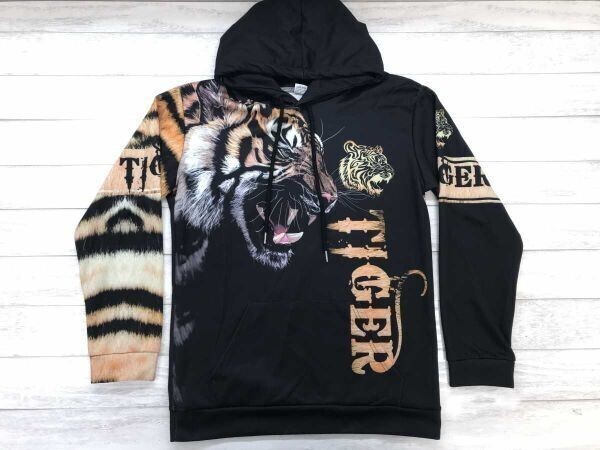 > ストリート リアル アニマル タイガー 虎 ダイナミック 転写ビッグプリント ジャージー パーカー メンズ バックプリント有 S 黒