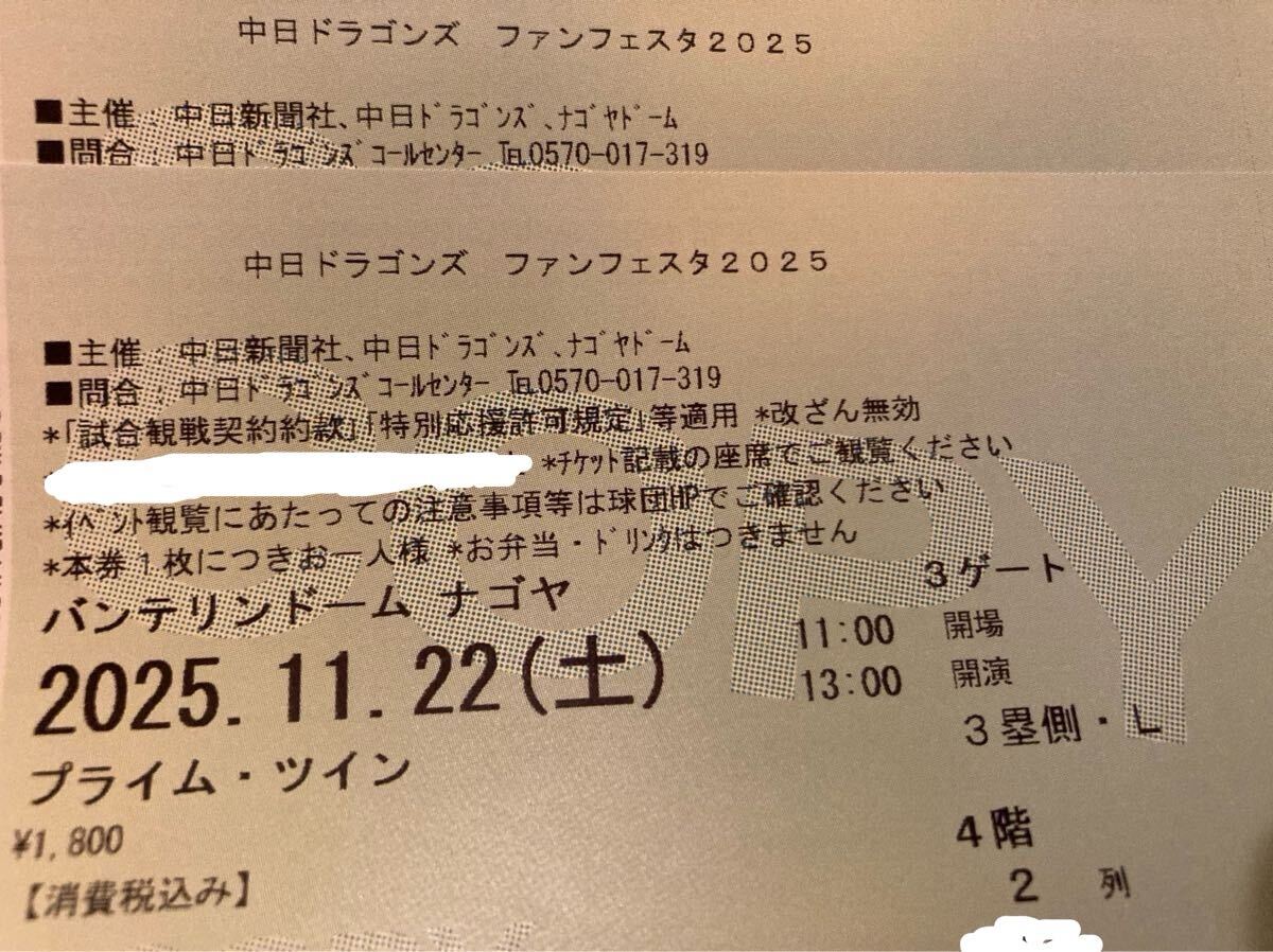 - 中日ドラゴンズ ファンフェスタ2025★11/22(土) 11:00開場 13:00開演 バンテリンドームナゴヤ プライムツイン内野3塁側2枚 弁当ドリンク無