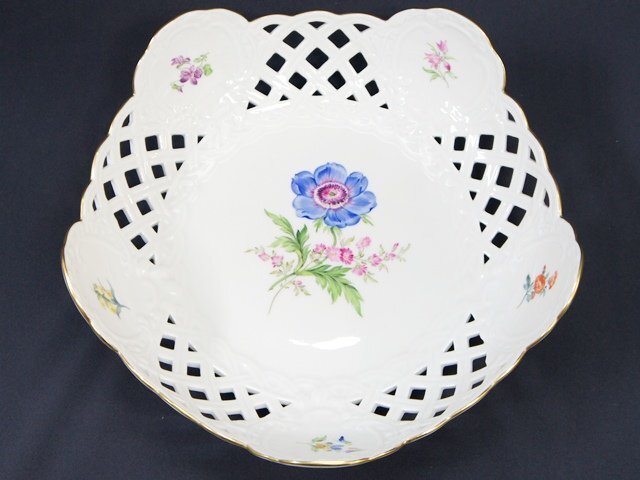 > 希少品・美品【Meissen マイセン】透かしボウル 23cm ベーシックフラワー フラワーブーケ 2つ花 二つ花 バスケット プレート 491g